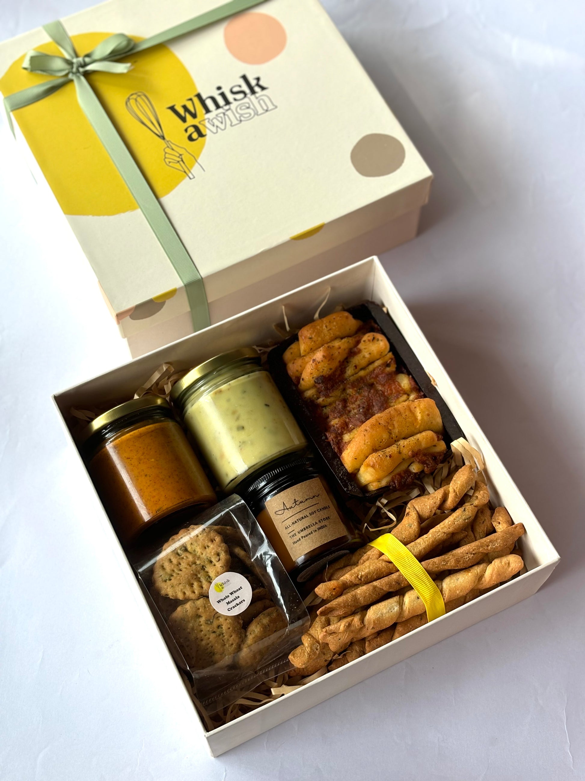 1 Small Garlic Bread, 2 Kinds of Savoury Butters, 100gm Methi Crackers, 100gm Grissini, Jowar Cracker/100gm Luxury Candle.
